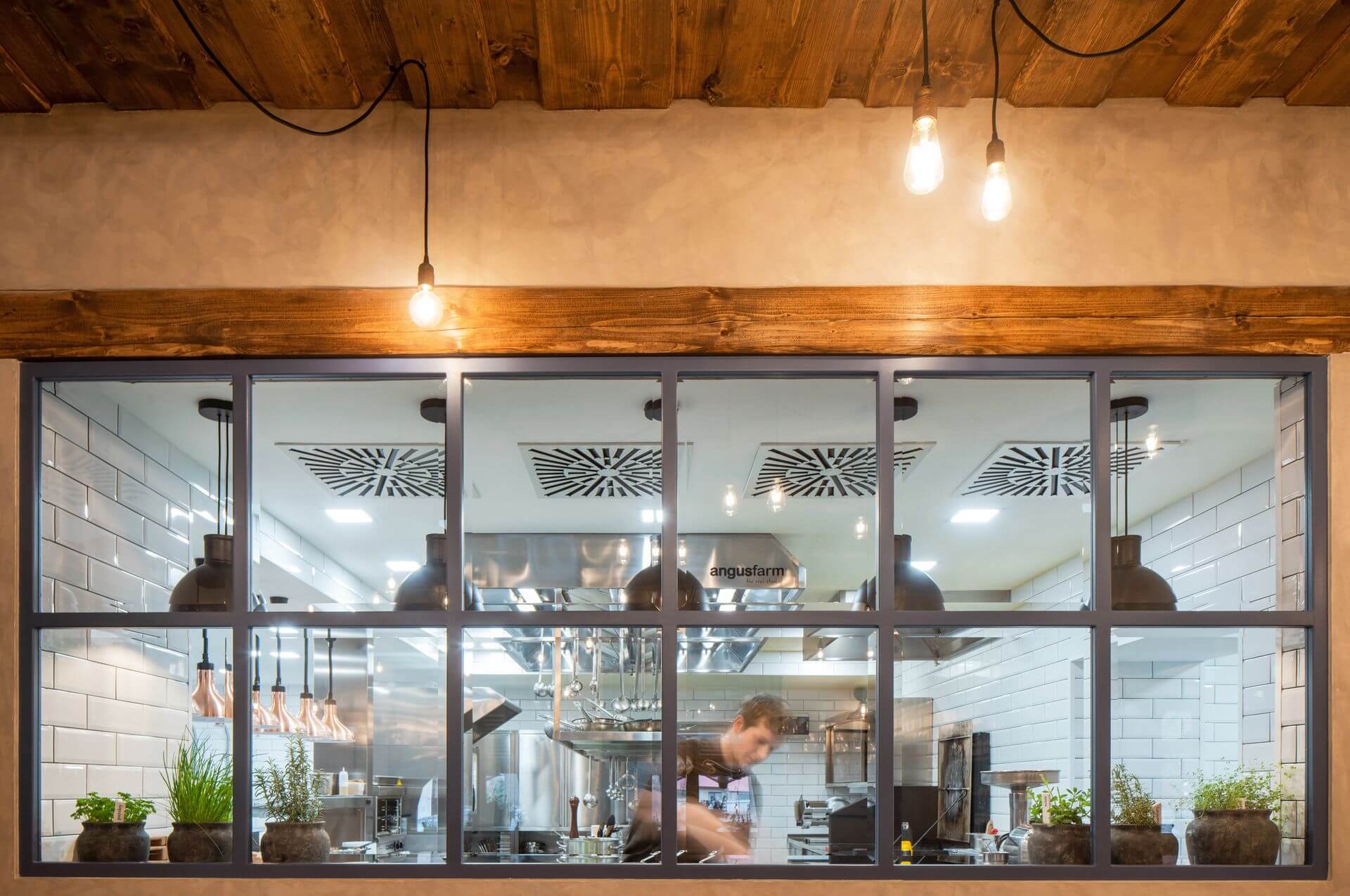 Gril je dominantou celé kuchyně. Funguje na dřevěné uhlí. To zajistí jednak vyšší teplotu a tím pádem rychlejší grilování (ve srovnání s plynovým nebo elektrickým grilem) a jednak nádhernou vůni, kterou vdechne pokrmům. Na grilu připravujeme třeba maso na AF burgery a především naše vyhlášené steaky.
