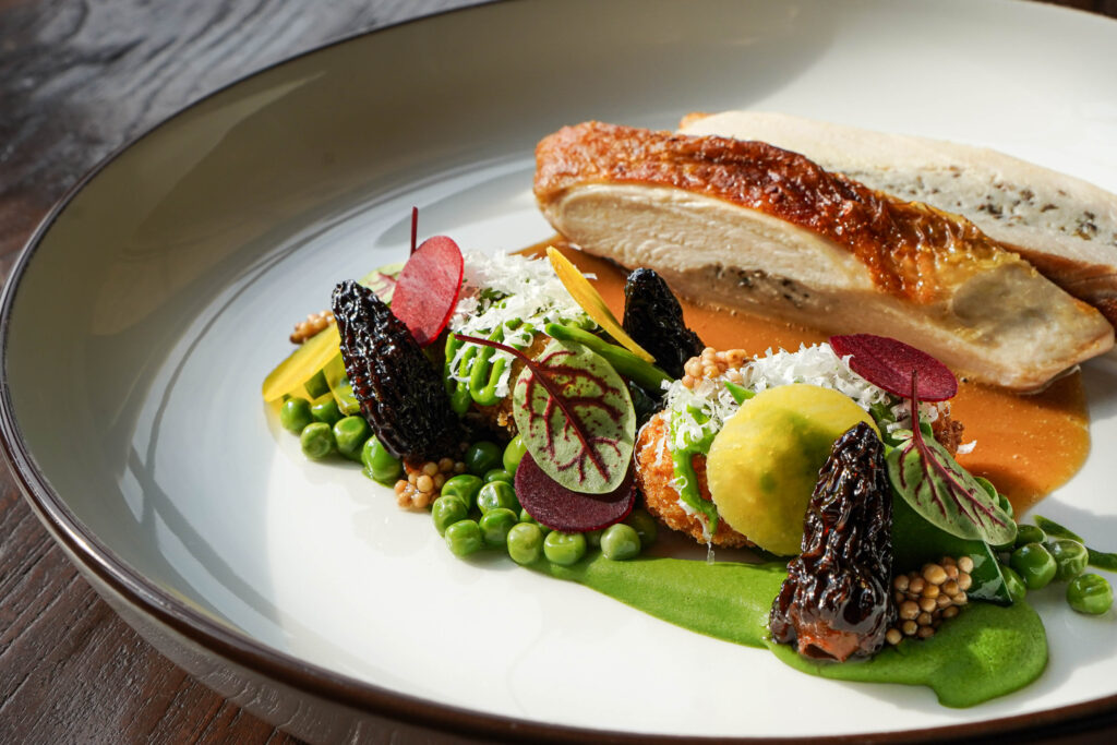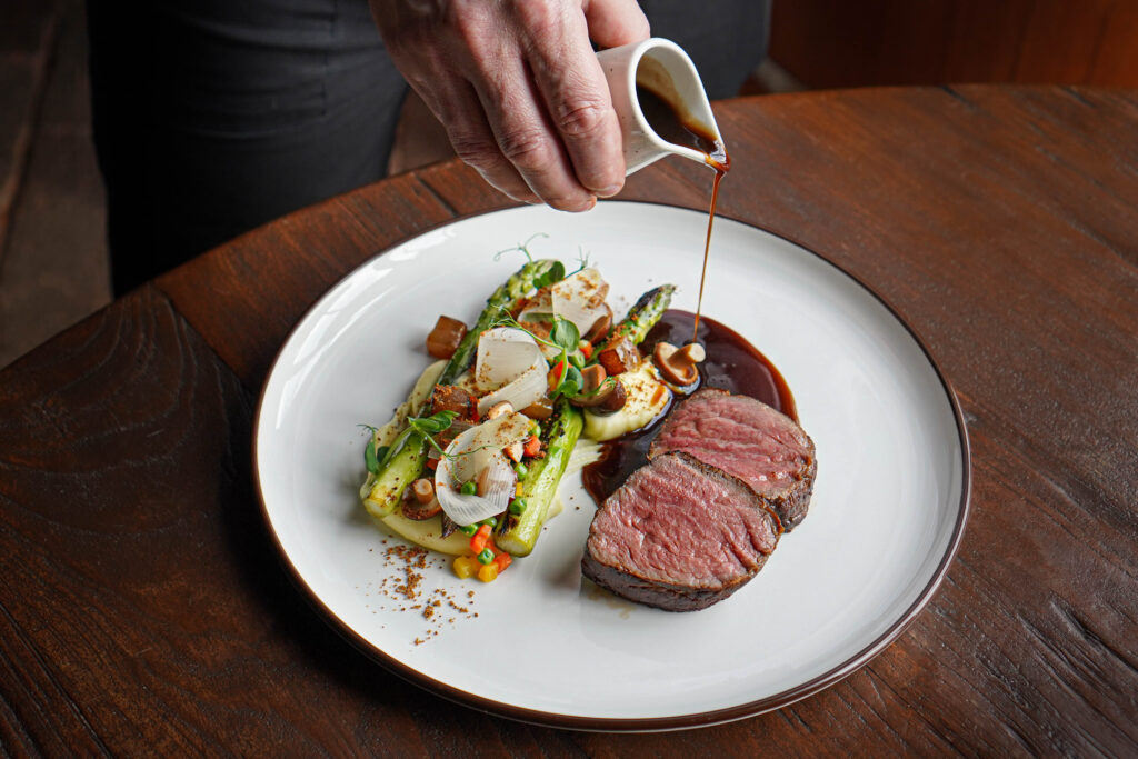 Angus rump steak sous vide, spring vegetables, bacon, pickled mushrooms, smoked mashed potatoes, Madeira sauce