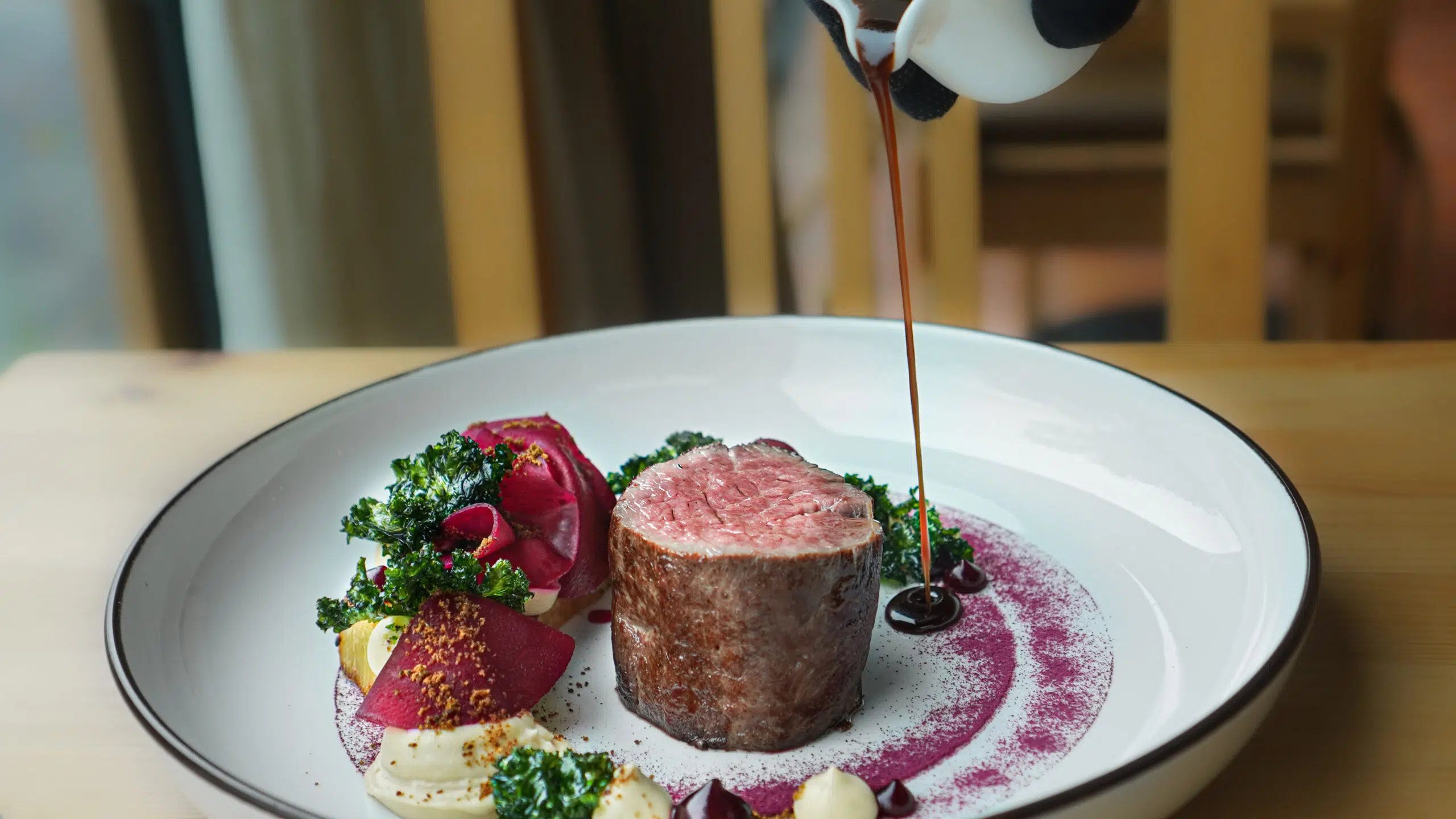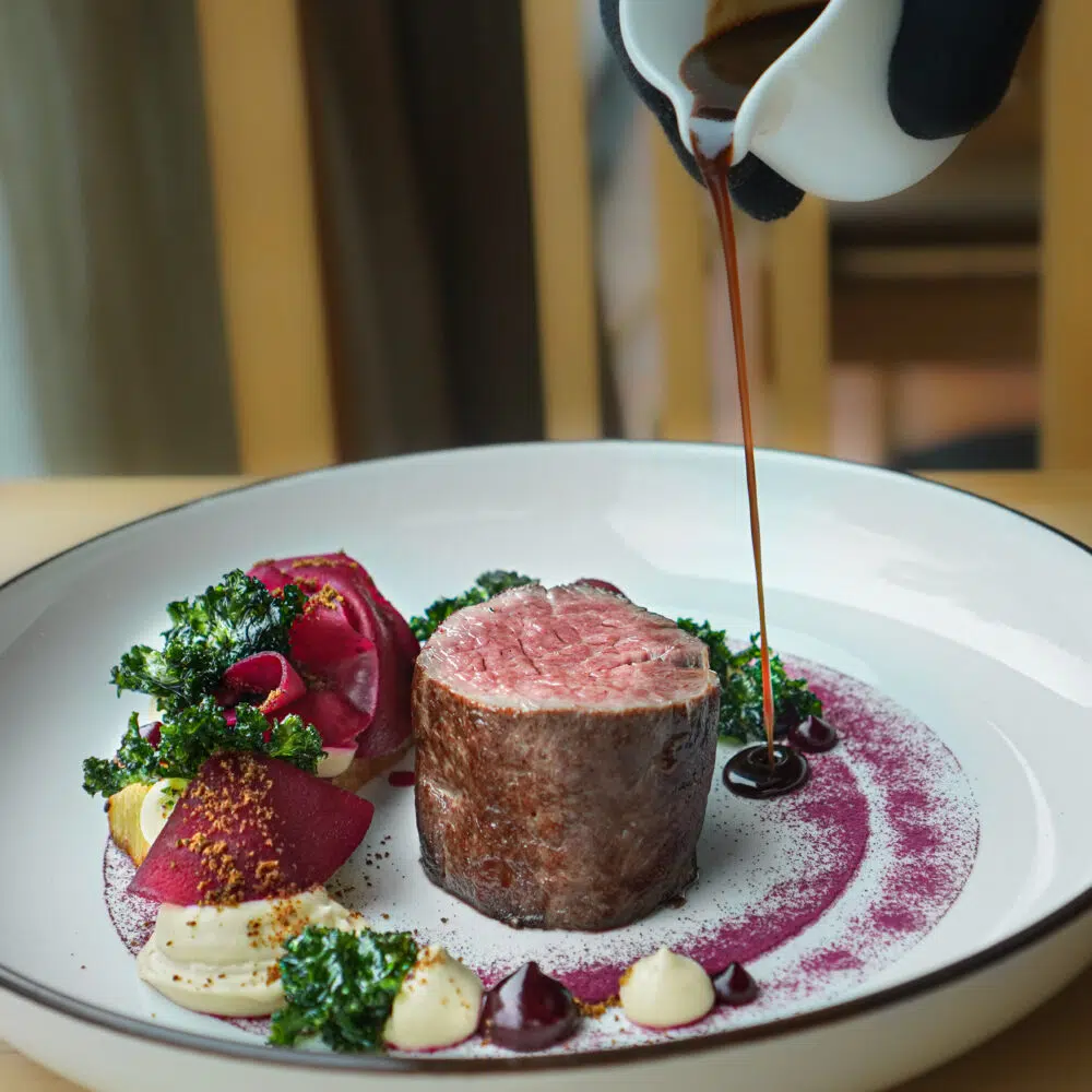 Angus svíčková, pyré z uzeného celeru, bramborové pavé, řepa, šípková omáčka s portským vínem